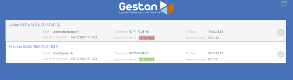 Toutes les informations de la base sont affichées: Prénom, Nom, Raison sociale, Téléphone, Email, IP du client, Nom du compte utilisé, Date de la demande et date de la clôture.