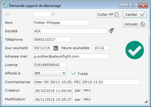 Par exemple, on voit sur cette fiche qui est un exemple-type que la demande de la Sté ADL a été prise en compte le 29/10 11:01, et effectuée OK par RM le 26/11 10:35