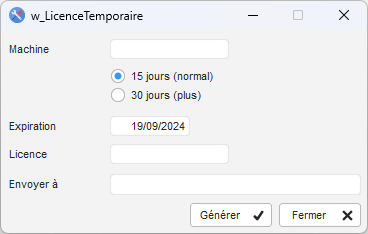 Lic temp permet de générer une licence temporaire. Sur l'écran, saisir le n° de machine, sélectionner une période, et un n° de licence est affiché, que vous pouvez communiquer à l'utilisateur.