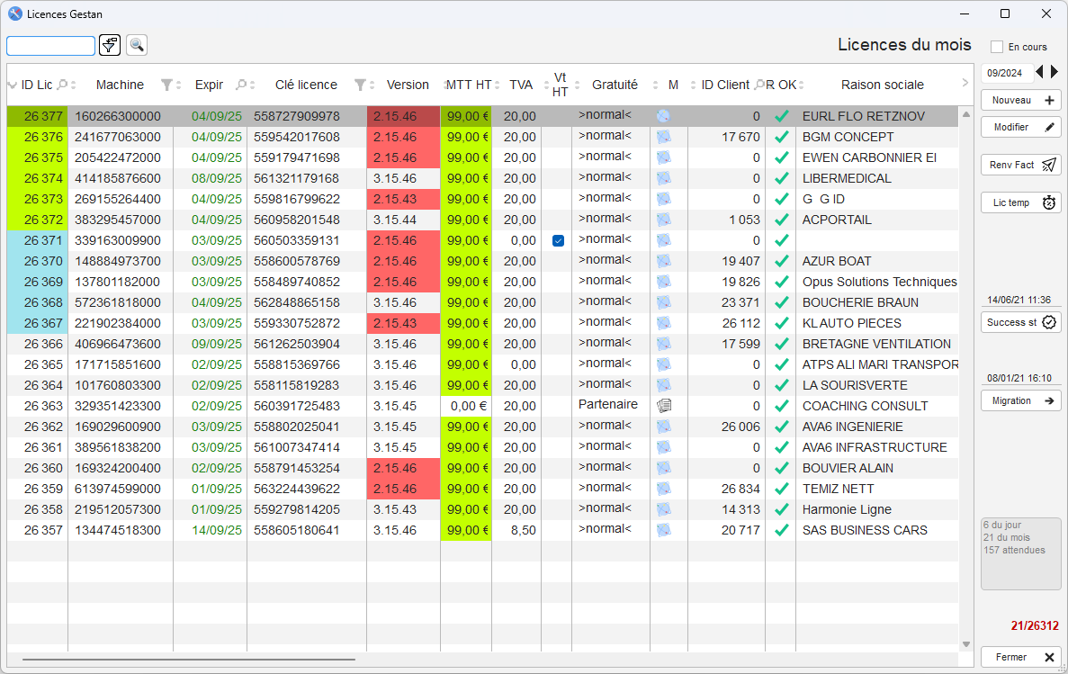 Le bouton Licences ouvre la liste des licences Gestan achetées sur le mois. Le spin permet de parcourir les mois, tandis que la case à cocher “En cours” permet de n'afficher que les licences en cours (par opposition aux licences expirées).