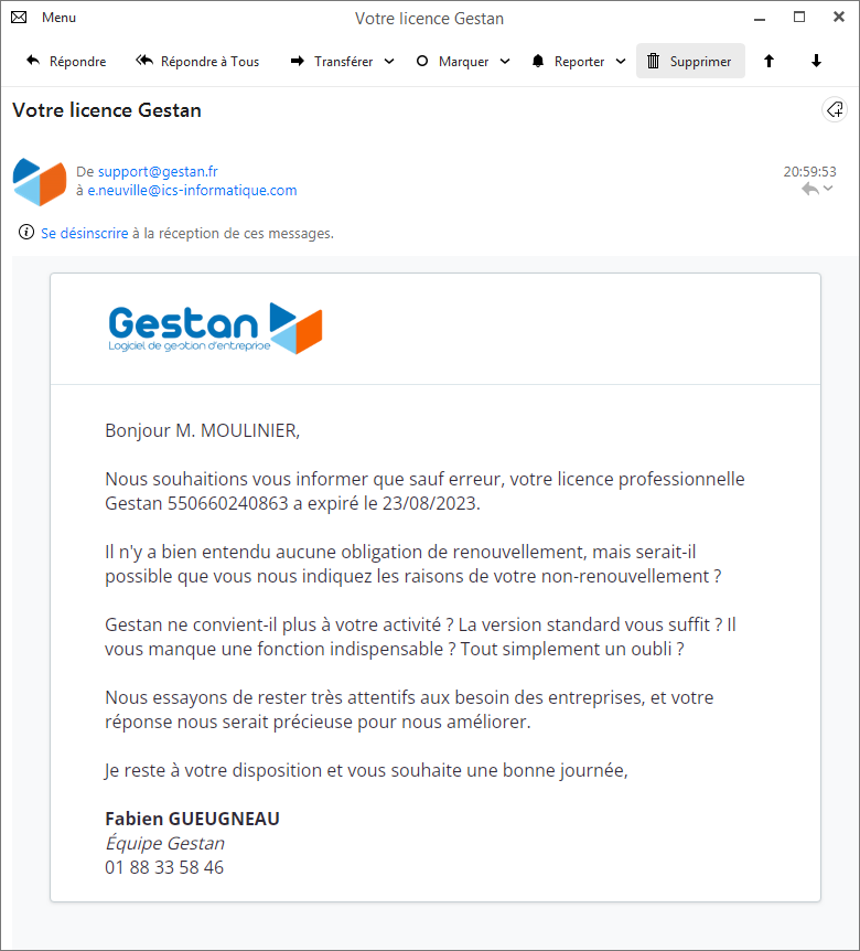 Le bouton Message permet d'envoyer le message ci-dessous, modifiable via les messages-type de gSupport. Il est recommandé de commencer par les messages individuels.