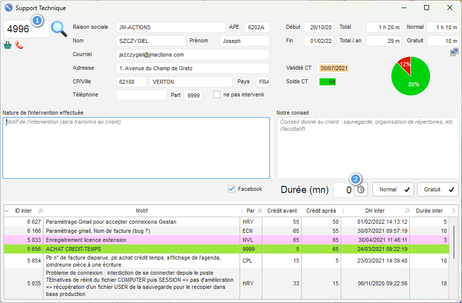 Entrez le nom ou l'ID du client dans la zone de recherche <badge>1</badge>, et cliquez sur le bouton de recherche. Cela affiche les coordonnées du client, et son solde de crédit-temps.