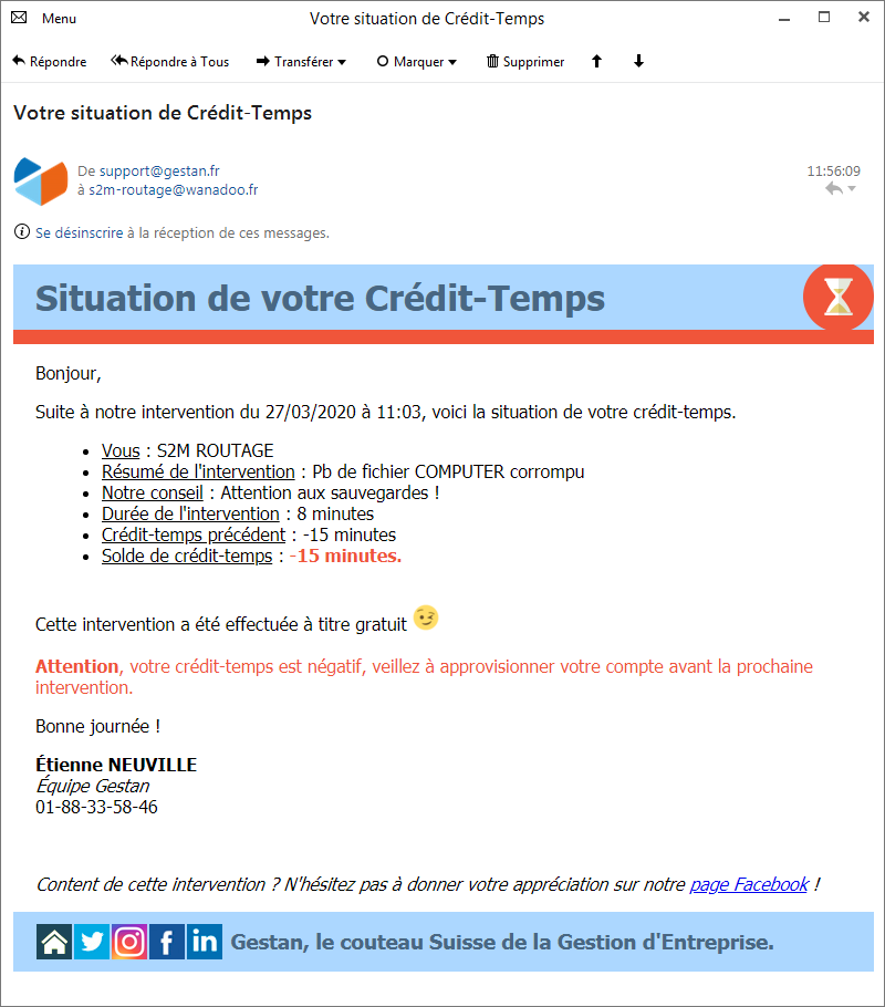 Le mail est signé du nom et du téléphone de l'intervenant, mais expédié depuis l'adresse support@gestan.fr.