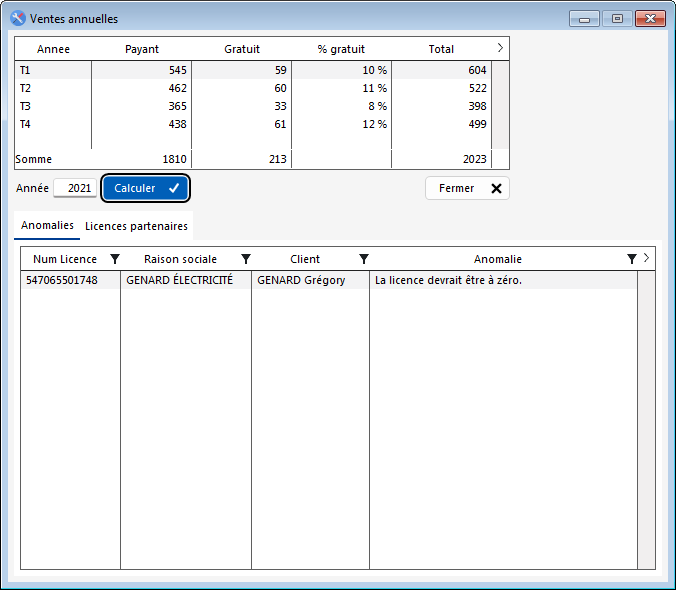 Cet écran totalise les ventes de licences par années de la vente (date de création de l'enregistrement).