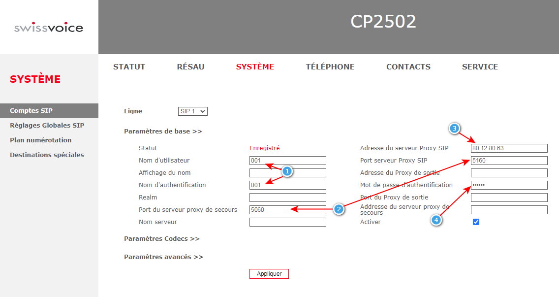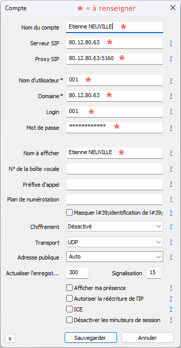 Ci-dessous les réglages à utiliser, utilisant le PABX d'ICS.