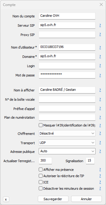 Le réglage de Freepbx et de la box étant assez compliqués, et relativement instable, il est possible d'utiliser directement sip5.ovh.fr comme serveur SIP et domaine, avec le téléphone 003318833xxxx comme nom d'utilisateur et le mdp sur OVH, mais il n'y a plus alors les fonctionnalités du PABX.