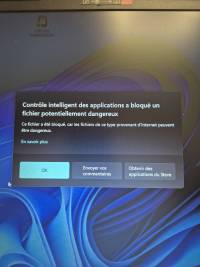 Solution : Réglages > Confidentialité et sécurité > Sécurité Windows > Contrôle des applications et du navigateur > Paramètres de contrôle intelligent des applicationset sélectionnez Sur pour allumer ou À l’arrêt éteindre. La désactivation de Smart App Control est permanente, car elle ne peut être réactivée que lors de l’installation de Windows.