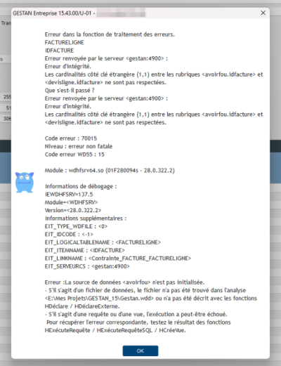 | Problème | En C/S, un problème récurrent est celui des erreurs d'intégrité observées éventuellement entre le fichier FACTURE, et un alias différent pour les lignes, par exemple AVOIRFOULIGNE ou BLIVRLIGNE, au lieu de FACTURELIGNE. |